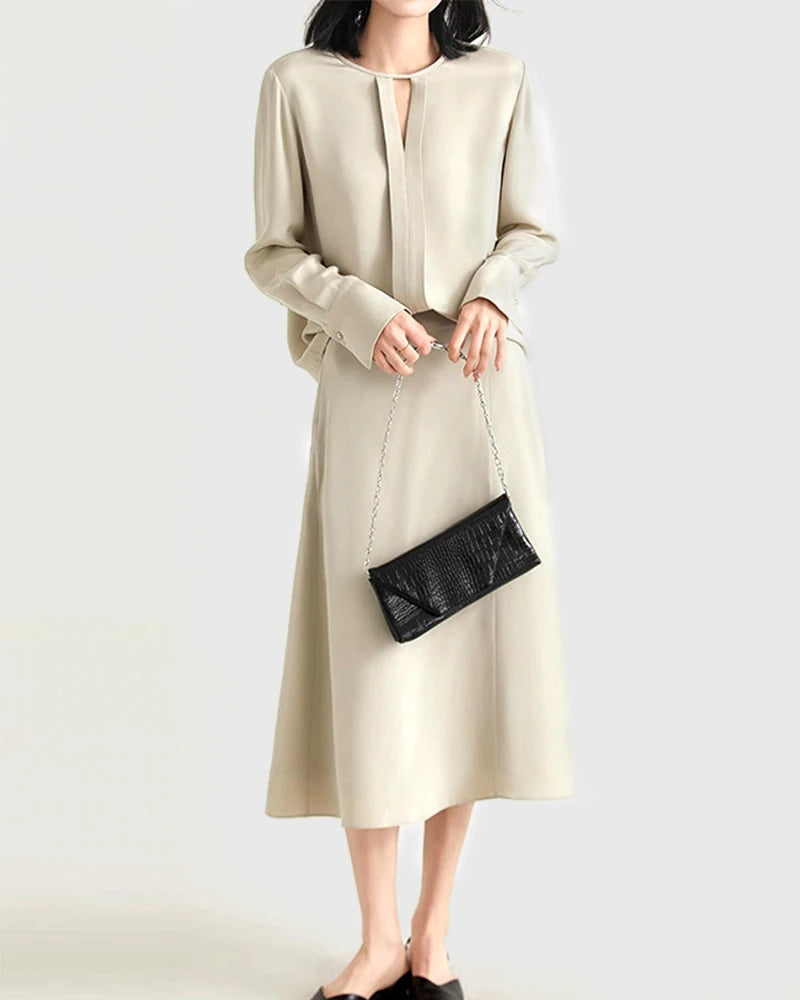 Featuring a modern slit neckline and long sleeves, this long sleeve silk blouse delivers effortless sophistication.