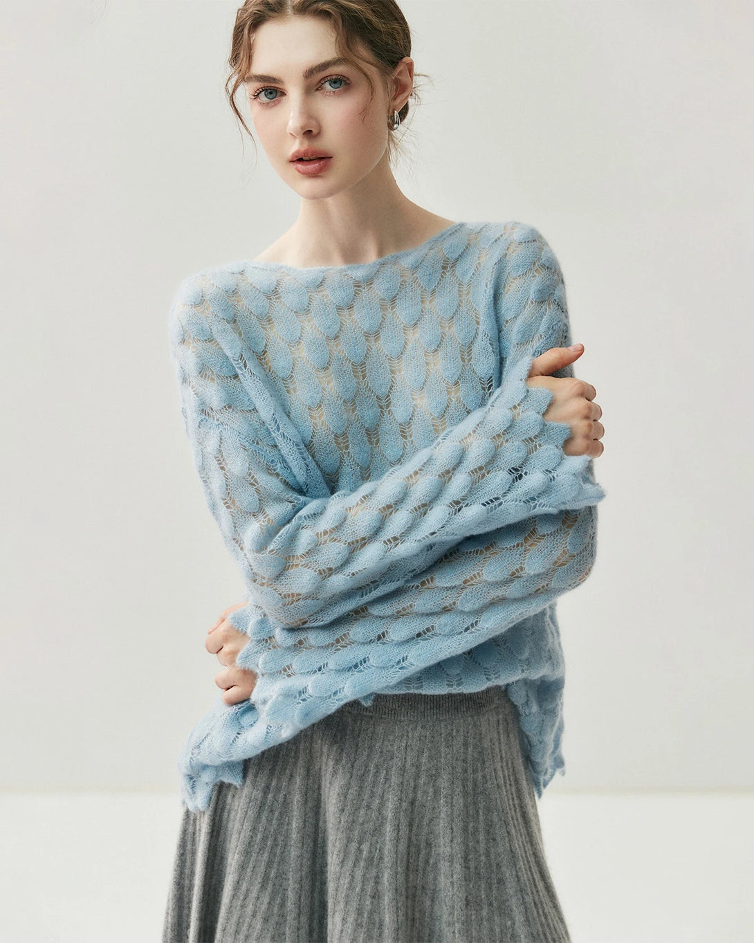 This crew neck pullover features flared sleeves and a delicate openwork cable knit pattern. Designed as a lightweight cashmere pullover sweater, it delivers refined style with a relaxed fit. The fine knit texture enhances its breathable nature, making it a perfect addition to womens cashmere wardrobes seeking effortless elegance.