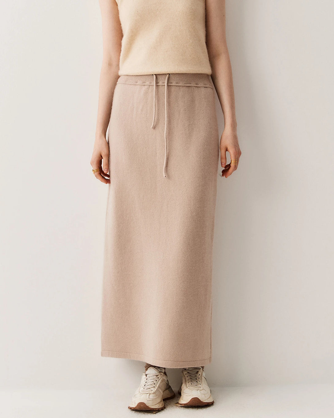 This women’s cashmere wool skirt features a straight silhouette with a refined back slit for graceful movement. A drawstring waist allows for adjustable comfort, while the clean flat-knit construction creates a timeless, versatile look. Perfect when styled as part of a cashmere skirt and sweater set or worn with a cashmere jumper for effortless sophistication.