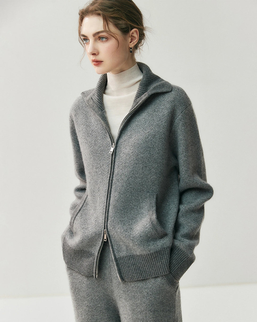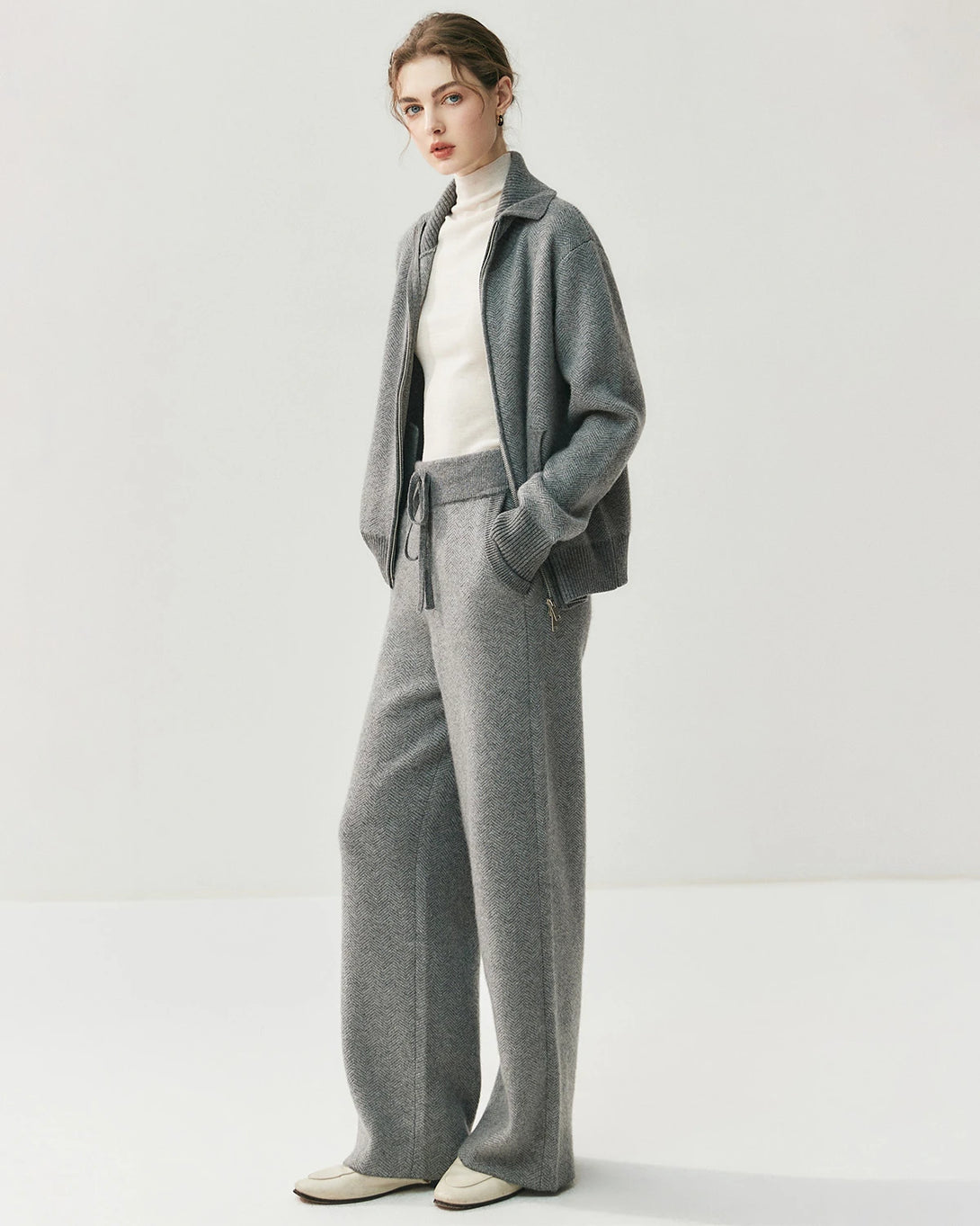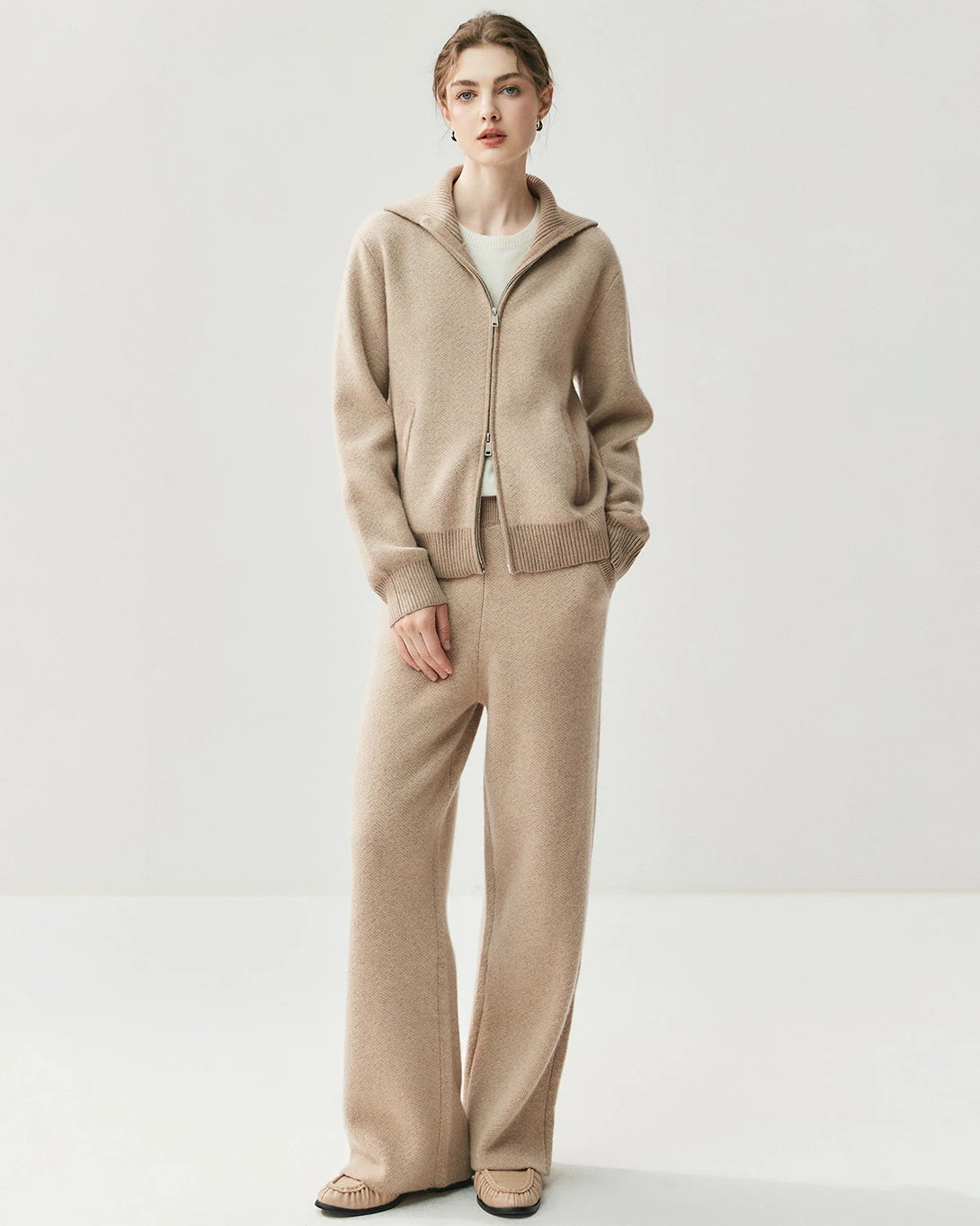 Refined comfort meets timeless design in the DaisySilk Cashmere Wool Zip Cardigan and Pants Set. Spun from a premium 65% wool and 35% cashmere blend, this women’s cashmere set offers a perfect balance of softness, warmth, and breathability. The double-zip high-neck cardigan features side pockets and a foldable collar that transitions from cozy to polished with ease. Matched with straight-leg cashmere pants, this set embodies understated luxury — ideal for travel, lounging, or sophisticated casual wear.