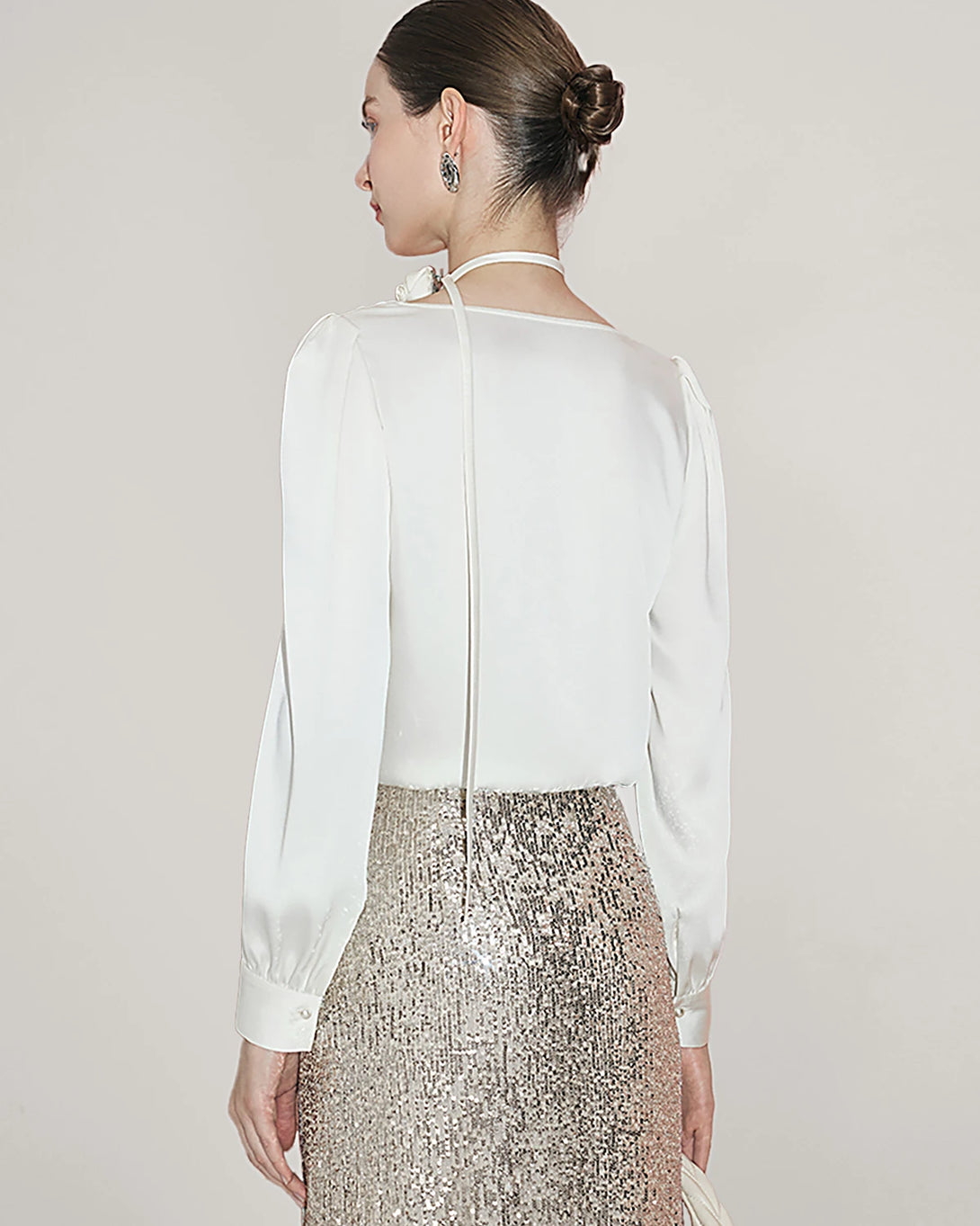 Featuring an elegant draped collar and romantic puff sleeves, this long sleeve silk blouse elevates your wardrobe with timeless sophistication. The delicate rosette necklace detail adds a feminine touch, making it ideal for ladies silk blouses in white, black, pink, or green for versatile styling.