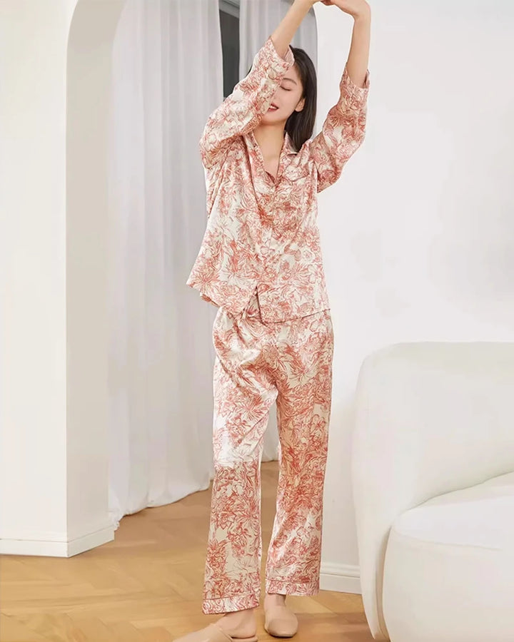 Inspired by minimalist elegance, this womens silk pajamas set features a delicate white-outline floral print across a soft silk base. The floral pajama set blends artistic refinement with effortless comfort, showcasing hand-drawn floral motifs that evoke a sense of calm and femininity. The long sleeve top with refined piping and matching pants create a sophisticated yet relaxed look.