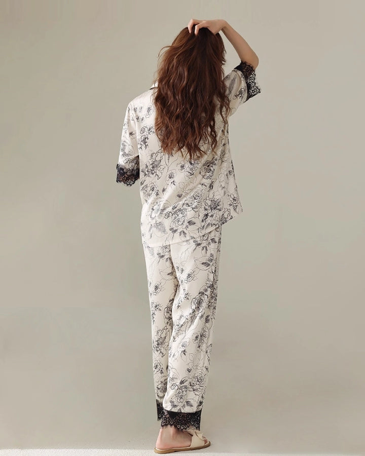 This floral silk pajama set features delicate white-outline floral prints, paired with black lace trim on the sleeves and pant hems for a refined, feminine touch. The short sleeve top and full-length pants offer a relaxed fit, ensuring comfort and freedom of movement. Designed in soft pastel tones, this floral short sleeve pajamas womens set balances playful style with sophisticated detailing.