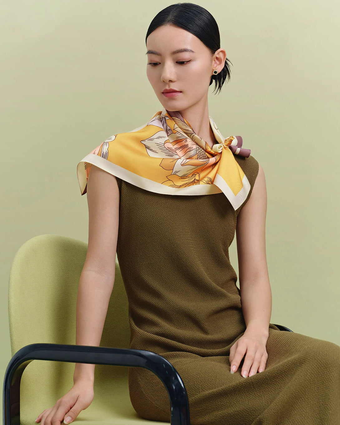 This square silk scarf features a chic yellow print, blending modern elegance with versatile styling. Its large size makes it perfect as a ladies head scarf, silk neck scarf, or even a silk scarf head wrap. Whether styled as a silk headband scarf, a silk shawl, or tied as a silk scarf with dress, it adds sophistication to every outfit.