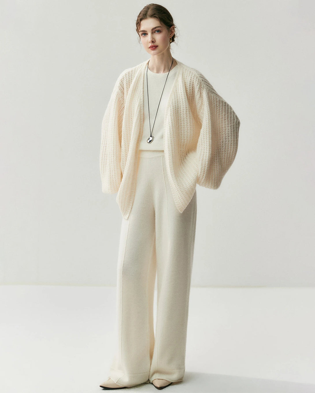 This oversized open front cardigan features a drop shoulder silhouette and voluminous lantern sleeves. With no buttons for a clean, effortless look, it drapes gracefully over any outfit. Designed as a timeless cardigan sweater cashmere piece, it blends modern ease with luxury craftsmanship.