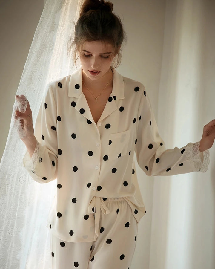 Polka Dot Lace Trim Silk Pajamas for Women