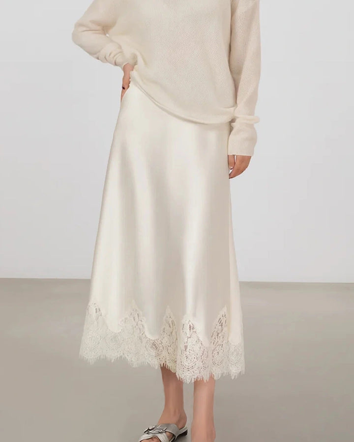 This silk midi skirt transitions effortlessly from everyday outfits to elevated occasions. The fluid motion of the bias cut pairs beautifully with the soft lace edge, offering versatility for both casual and formal settings. A standout choice within silk skirts for women, this piece delivers ease, grace, and timeless sophistication.
