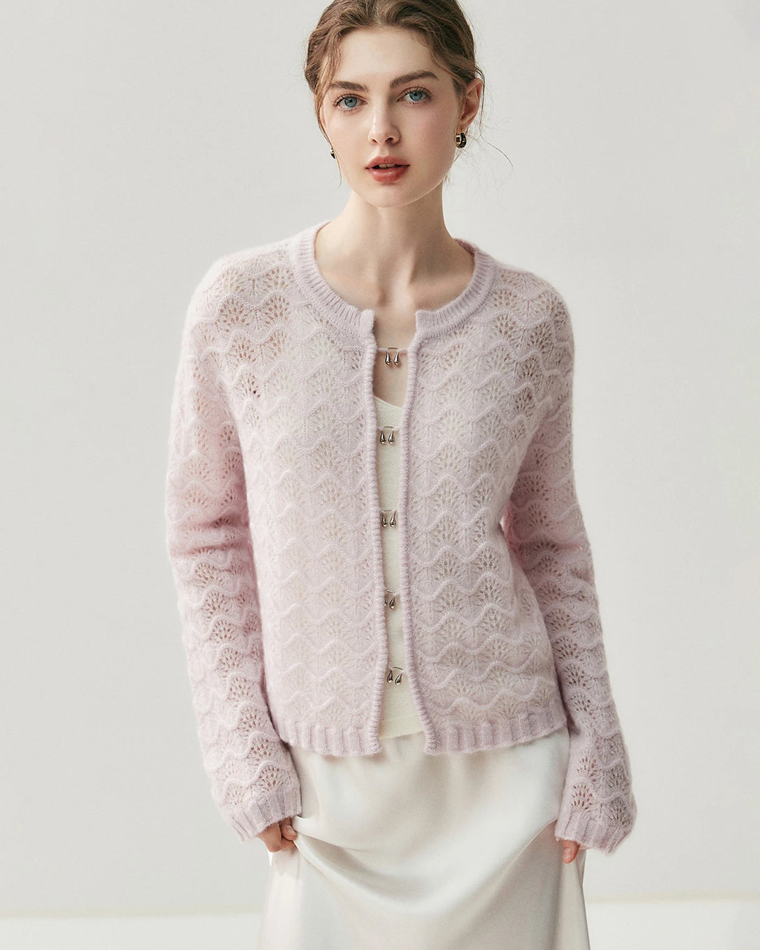 This round neck front open cardigan features an open-knit pattern with delicate hollowed floral details, giving it a semi-sheer and stylish look. The unique teardrop-shaped metal buttons replace conventional closures, elevating this cashmere cardigan sweater with a chic and modern twist.