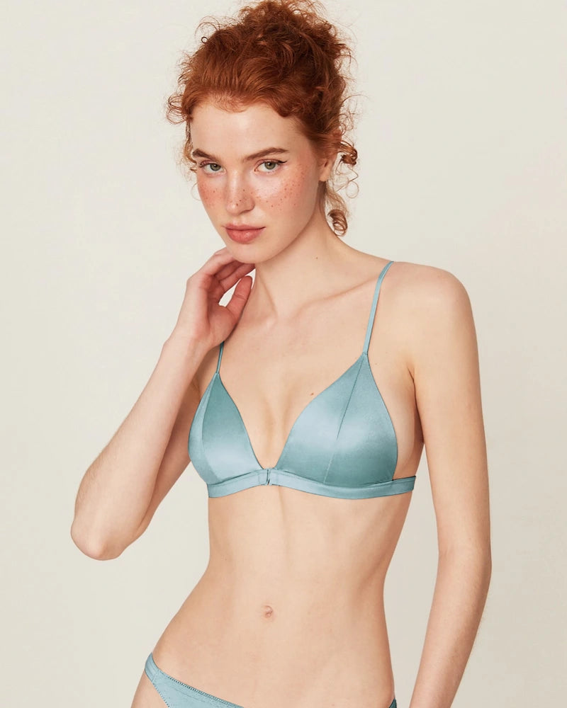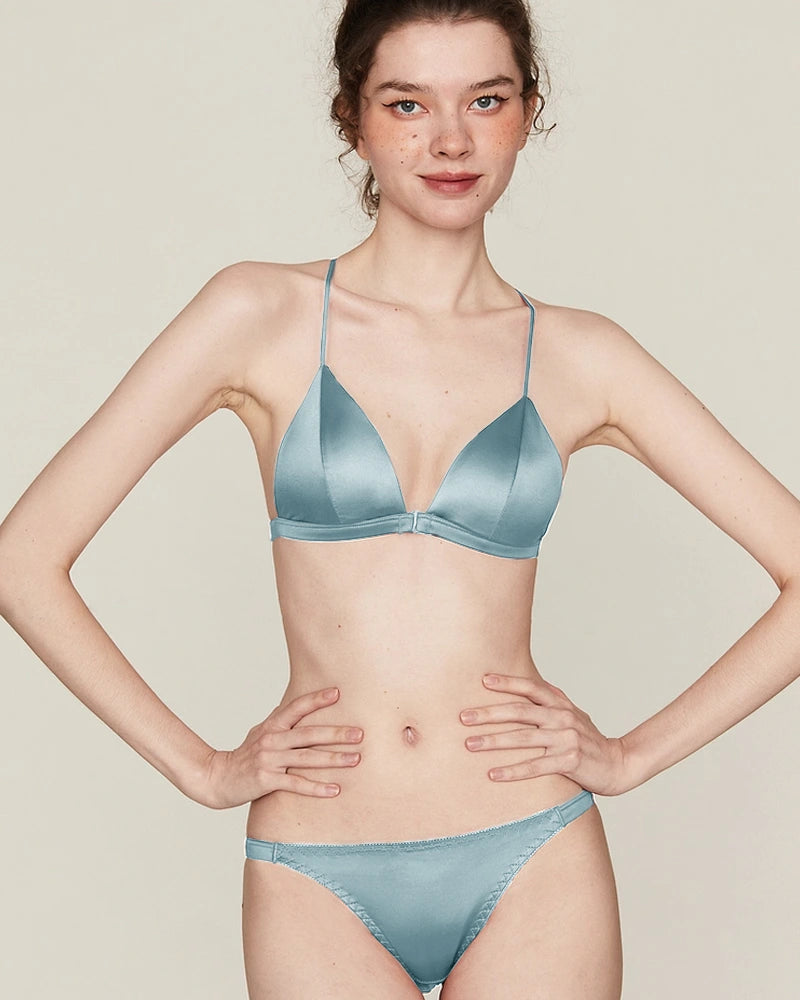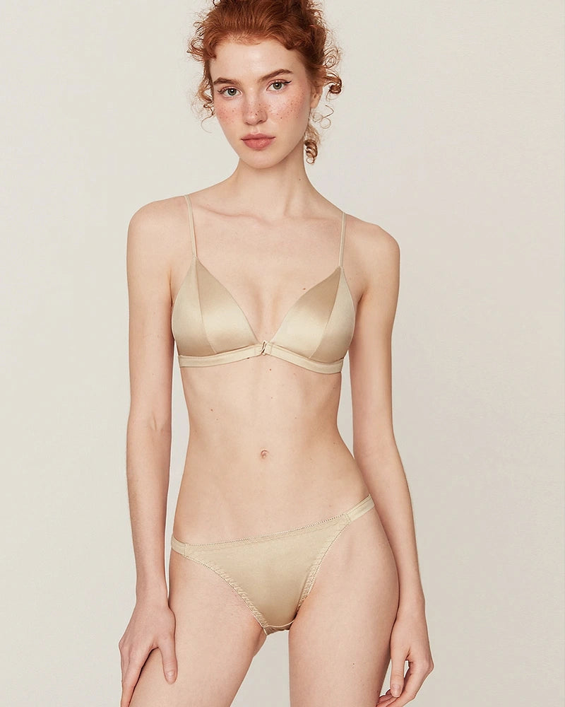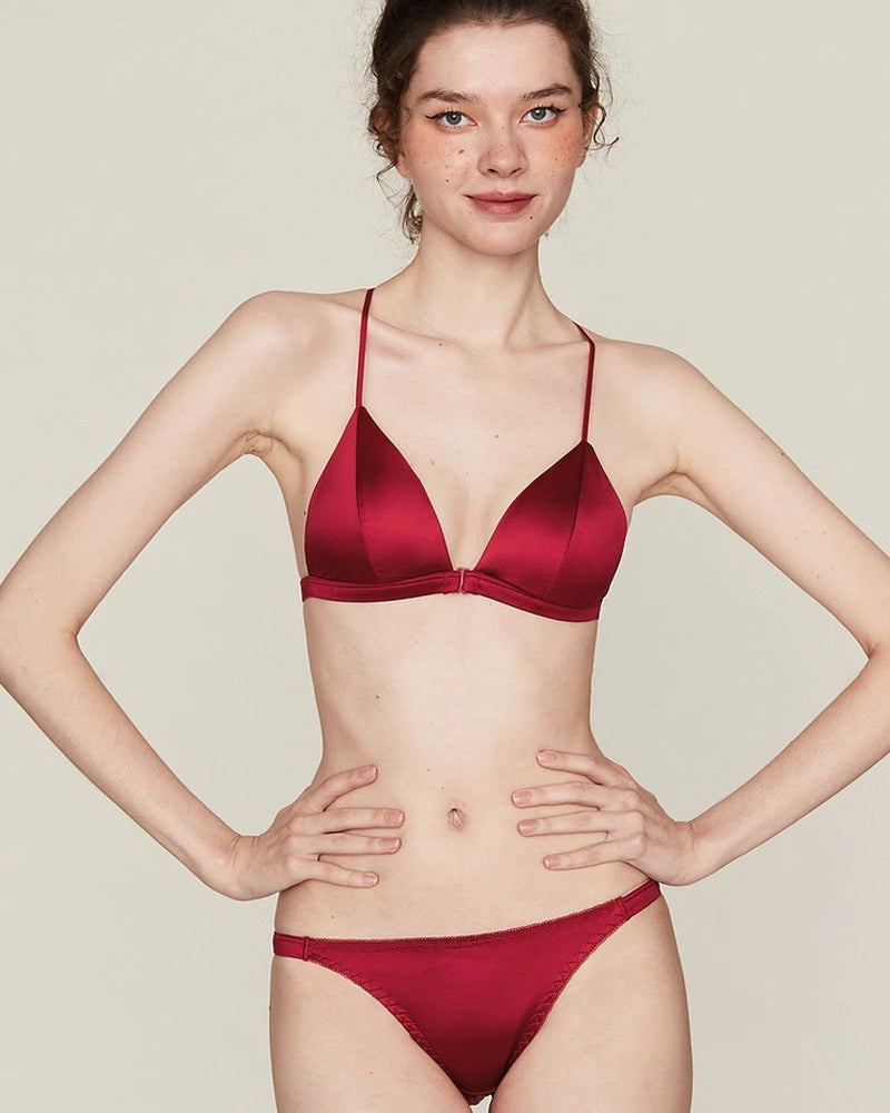 The triangle bralette design ensures light shaping while maintaining the signature softness of silk bras and panties. Whether you prefer bras without underwire, women’s wireless bras, or minimizer bras without underwire, this piece blends luxury and practicality. The front closure wireless bra style provides convenience and sophistication in one. It is also a thoughtful option for front closure bras for seniors and front hook bras no underwire lovers.