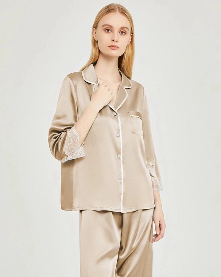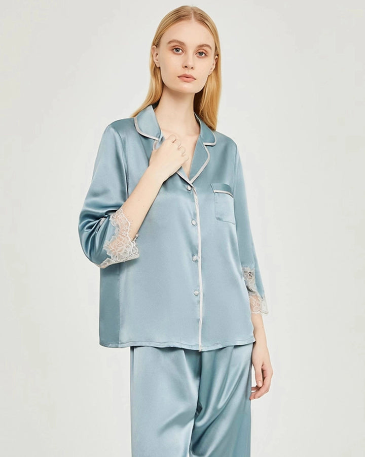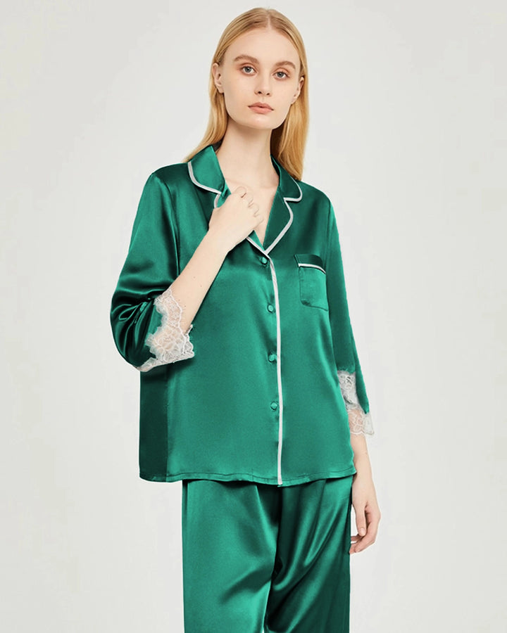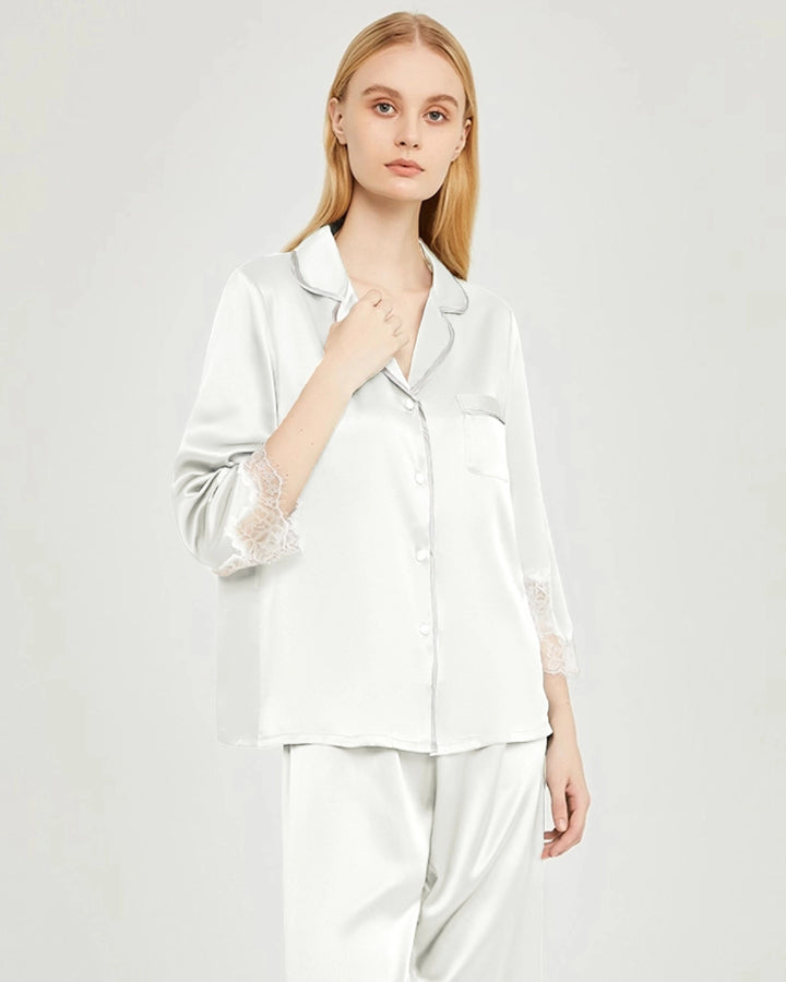 This silk lace trim pajama set for women features graceful mid-length sleeves and full-length pants, beautifully accented with delicate lace at the cuffs and hems. The refined details highlight the feminine charm of ladies silk pyjamas, blending modern elegance with classic bridal allure — perfect for pre-wedding mornings, bridesmaid silk pajamas, or honeymoon lounging.