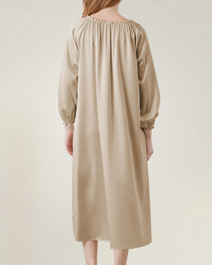 This women’s nightgown features a graceful round neckline with gentle ruched detailing and lettuce-edge trim on the cuffs and hem. The long sleeves and midi length create a balanced silhouette that flatters every figure. Inspired by vintage nightgown styles yet updated for modern comfort, it’s a perfect blend of softness and sophistication. Whether you call it a silk night dress for women or a ladies’ silk nightgown, every detail speaks of quiet luxury.