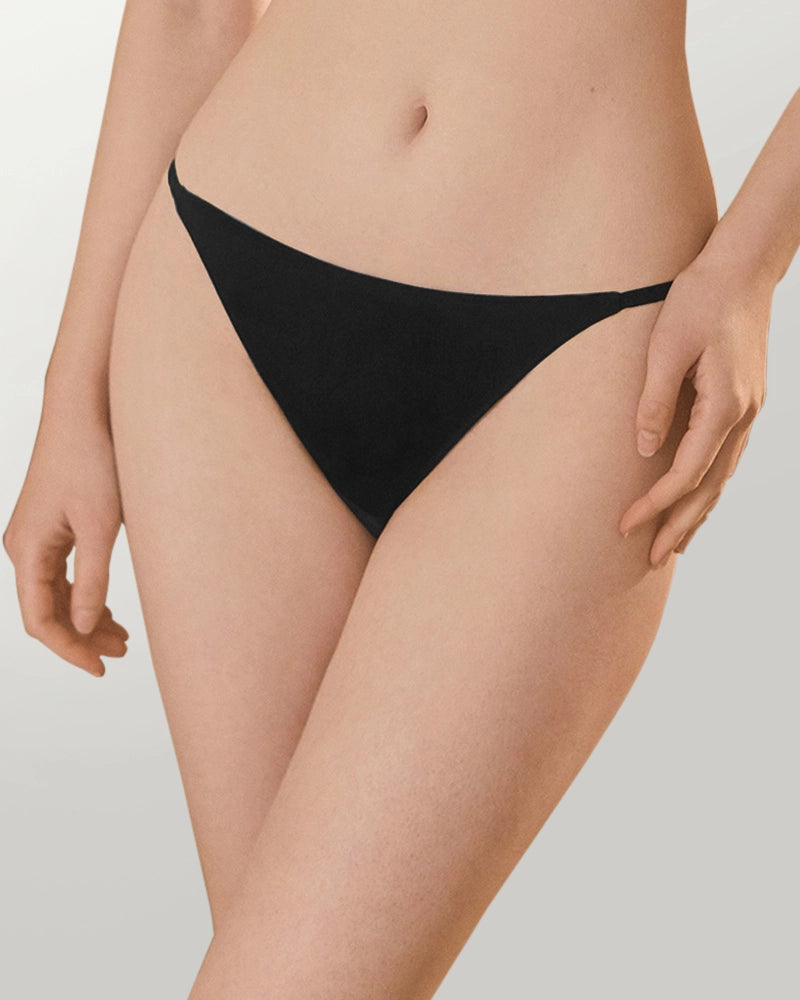 The wireless triangle bralette features slender adjustable straps that can be worn in two ways—straight or crossed at the back—for a personalized fit and refined look. The curved underband gently supports without the need for underwires, while the V string bikini panty adds a modern touch with delicate side straps and minimal seams for a smooth silhouette.