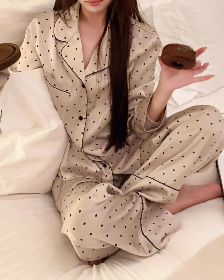 This elegant womens silk pajamas set features a classic small polka dot pattern in ivory white or champagne gold. The long sleeve top with piping details and matching full-length pants create a chic, coordinated look. The relaxed fit provides both style and freedom of movement, ideal for everyday lounging or sleeping.