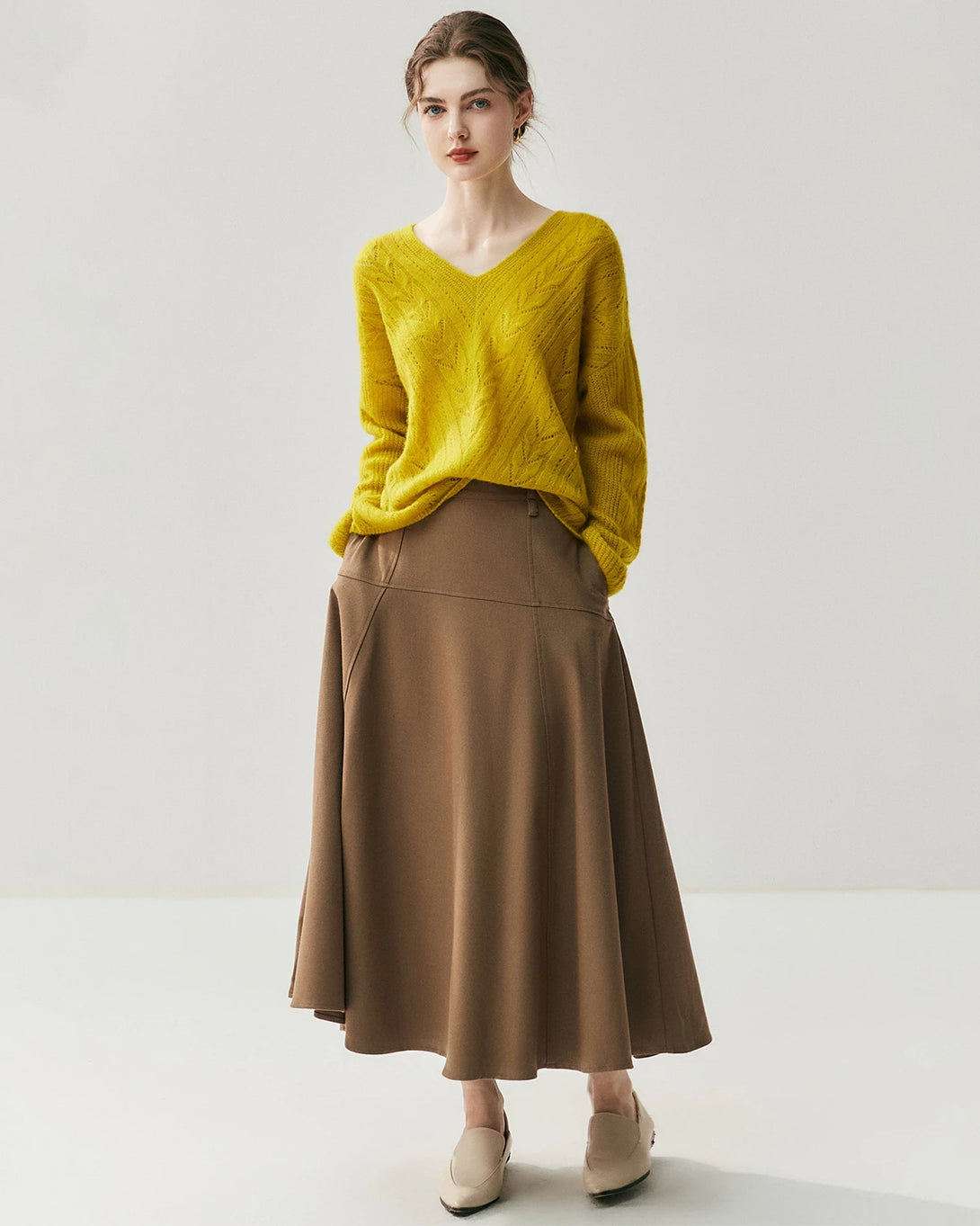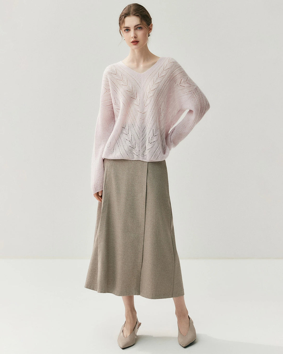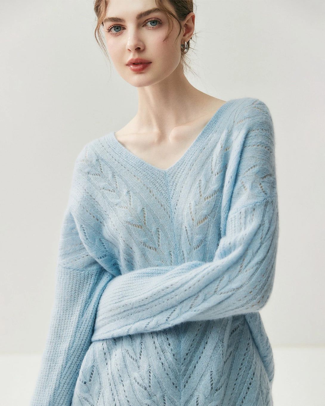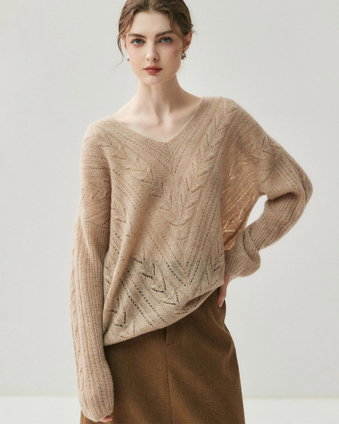 This lightweight V-neck pullover features delicate cable knit openwork with a refined, relaxed silhouette. Designed as a classic cashmere pullover sweater, it highlights timeless style and modern versatility. The fine knit structure makes it perfect as a lightweight cashmere sweater for women, suitable for women's v neck cashmere sweater and cardigan sweater cashmere looks.