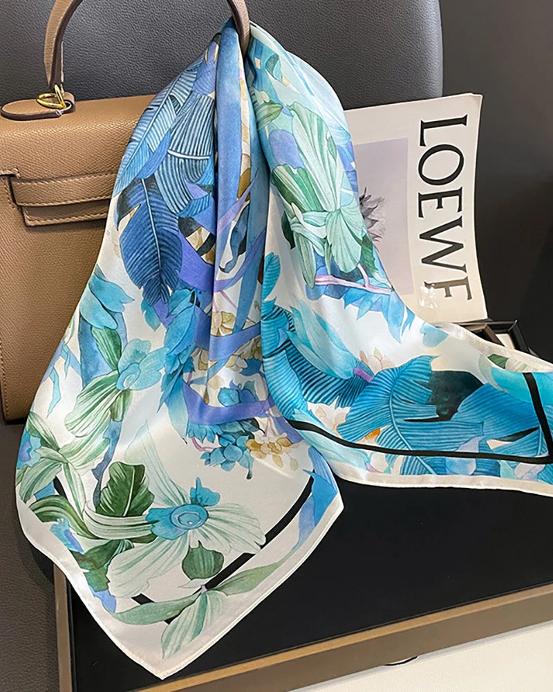 Its artistic floral and foliage pattern makes it a standout printed silk scarf, floral silk scarf, or sophisticated silk shawl.