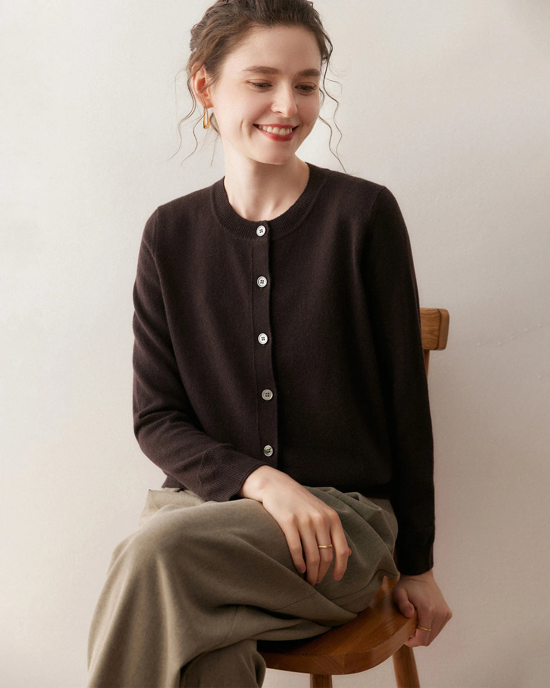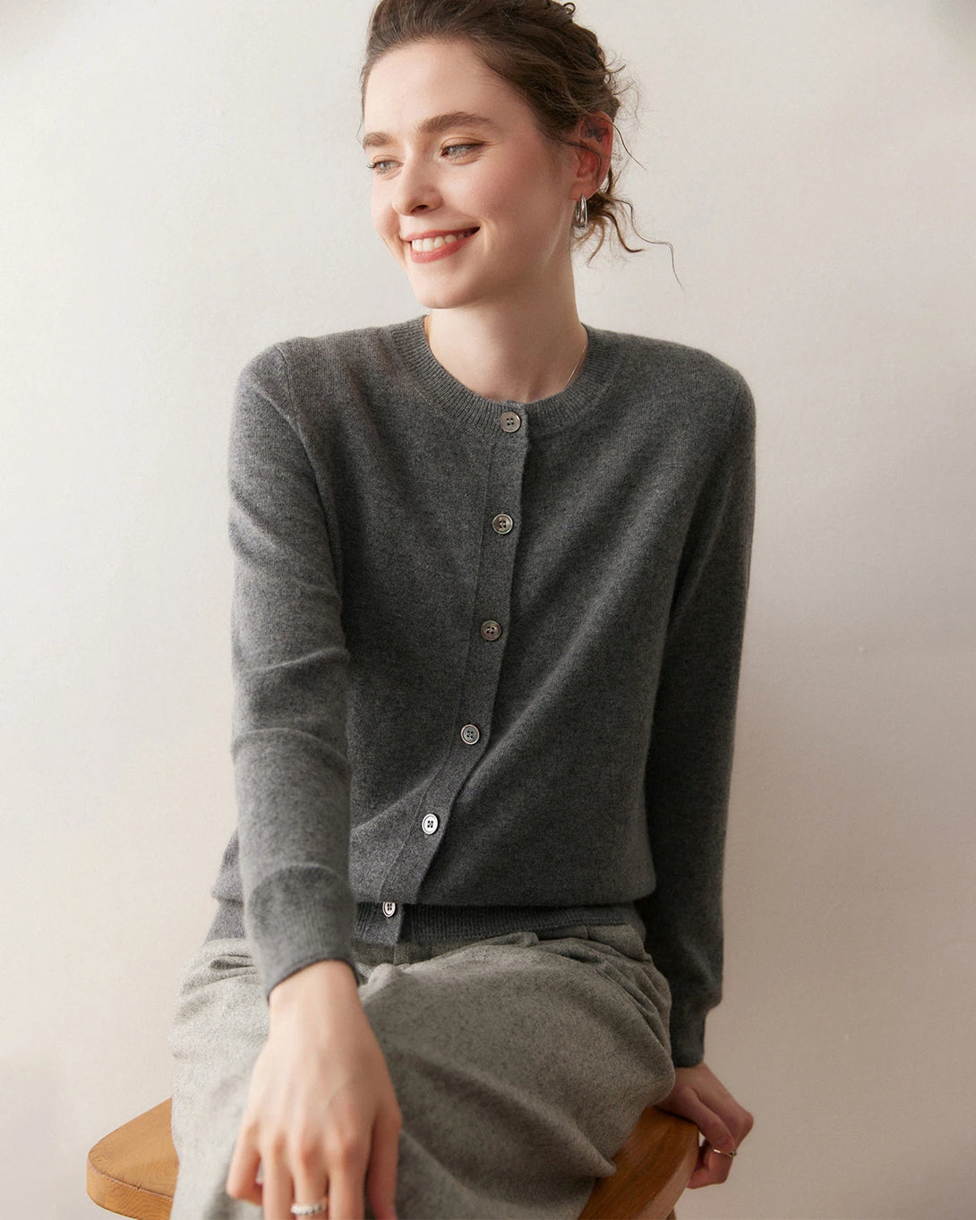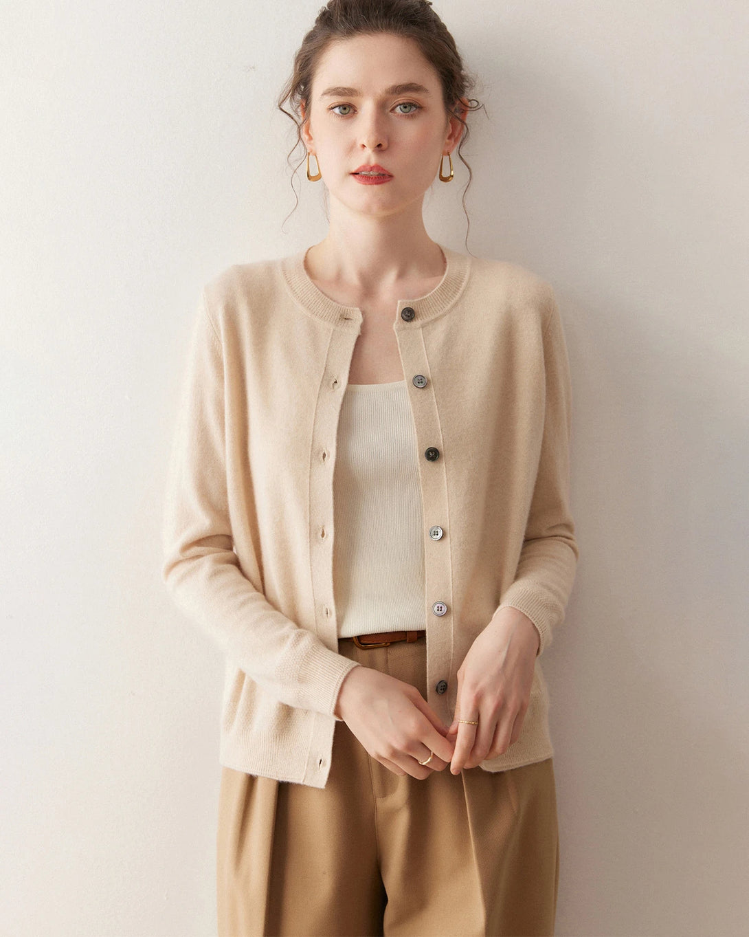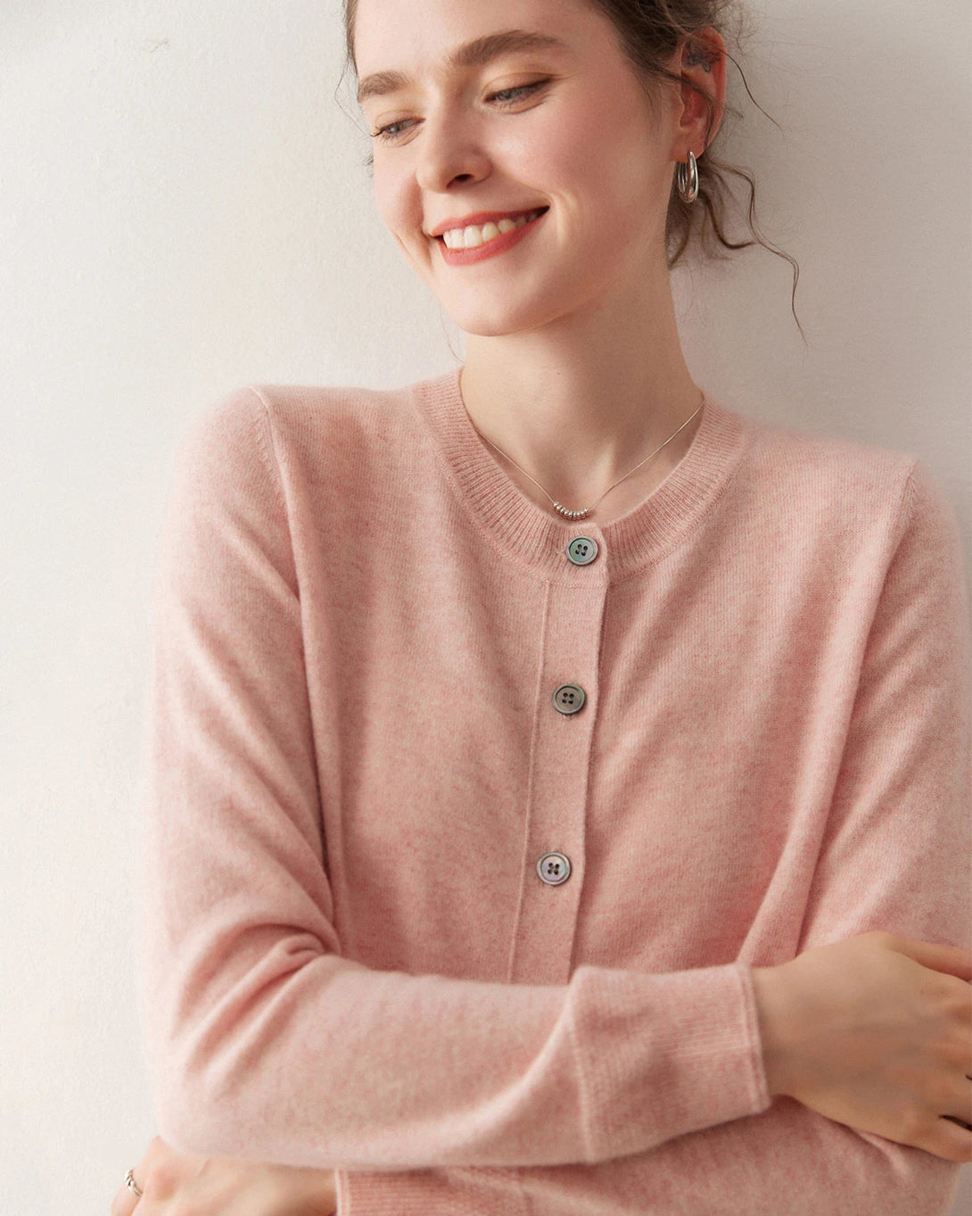This classic ladies cashmere cardigan features a minimalist silhouette with elegant natural shell buttons. Its clean lines, neat shoulder seams, and subtle ribbed edges create a timeless and versatile piece that pairs effortlessly with any outfit. The lightweight knit highlights the beauty of luxury cashmere sweater craftsmanship.
