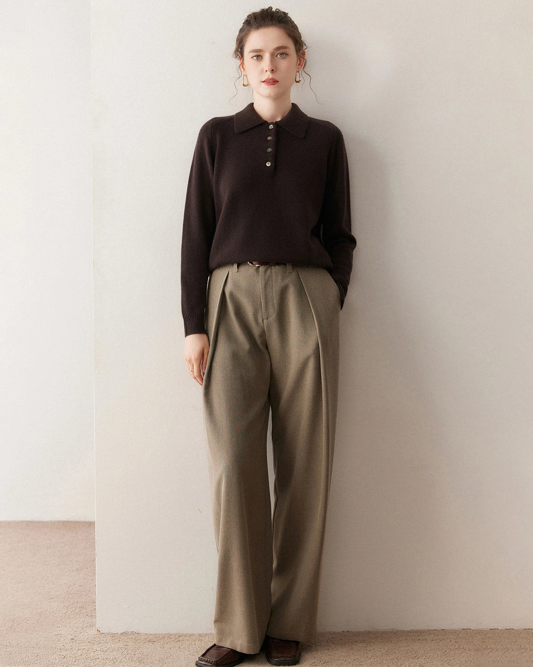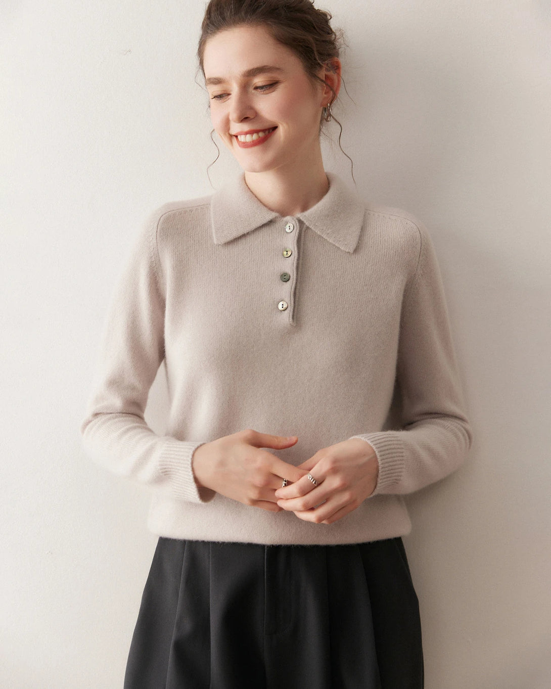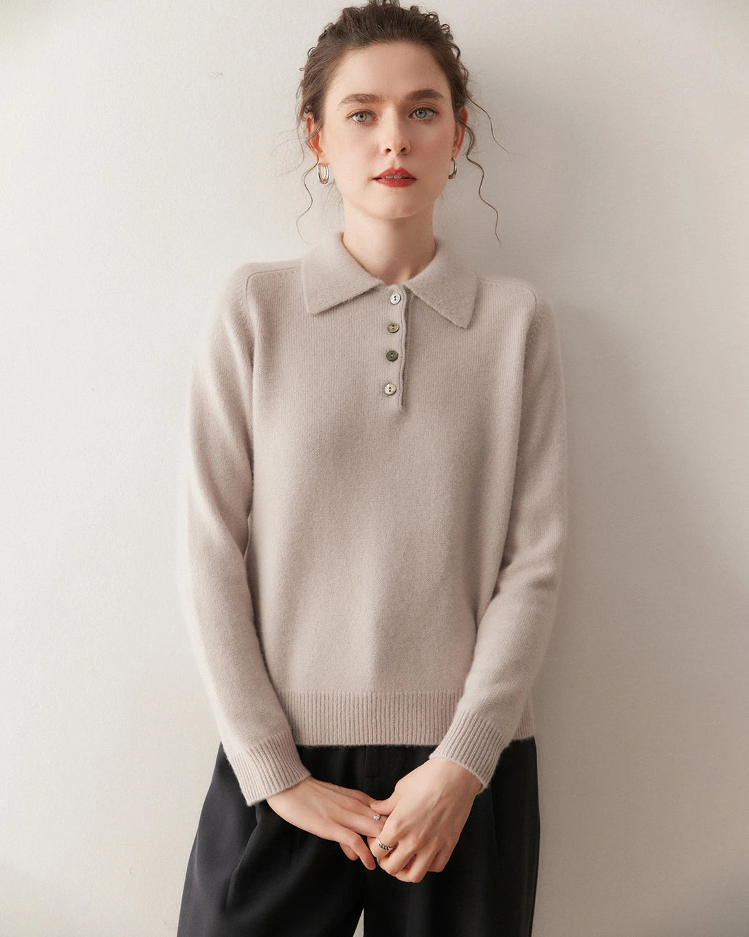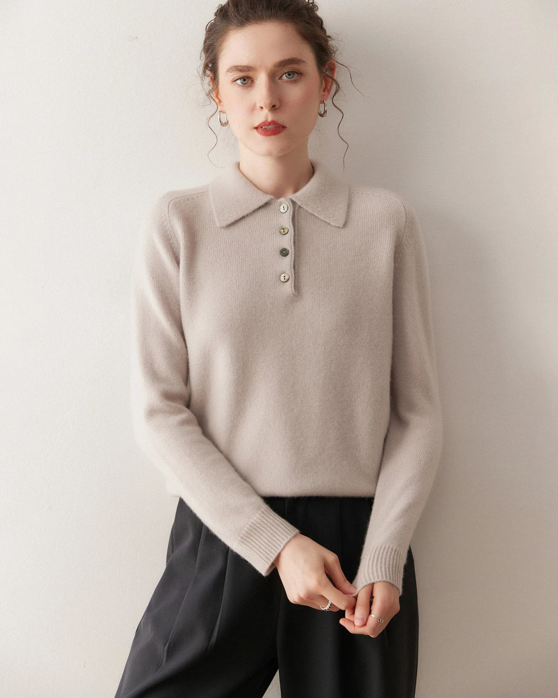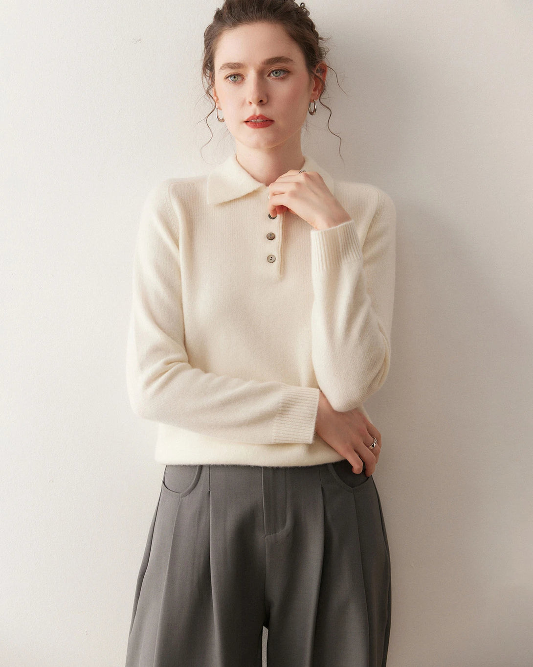 Featuring a polo neck with half-button placket and natural shell buttons, this cashmere pullover sweater combines elegance with casual sophistication. The classic saddle shoulder enhances structure and style, aligning with women's sweaters cashmere trends, cashmere turtleneck sweater, and chic cashmere cardigan women collections.