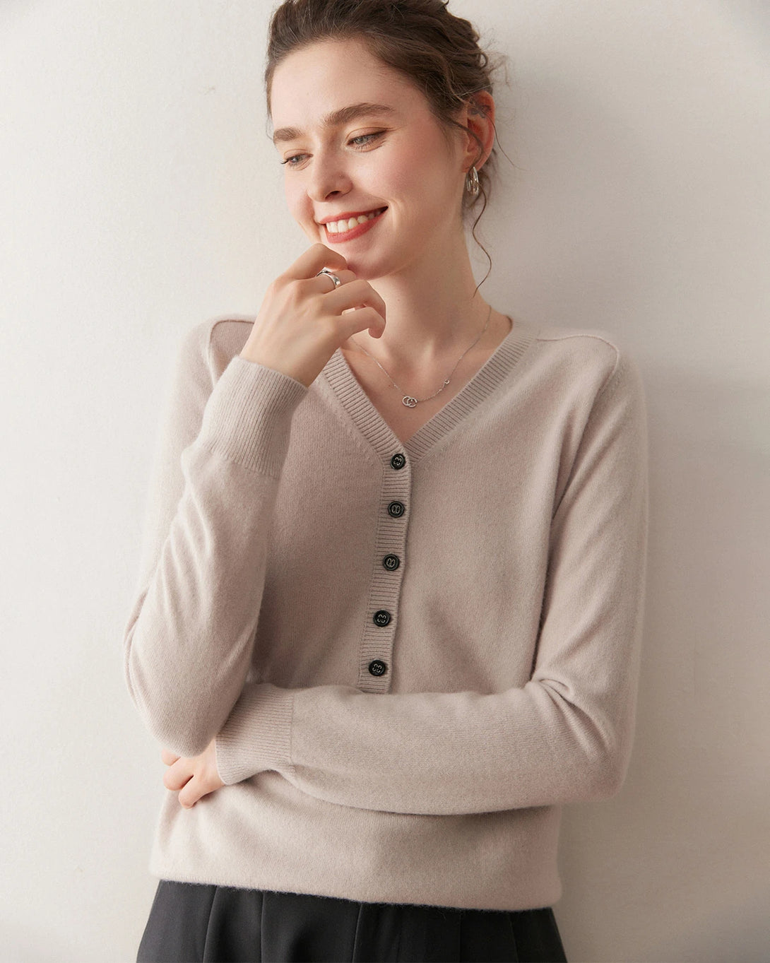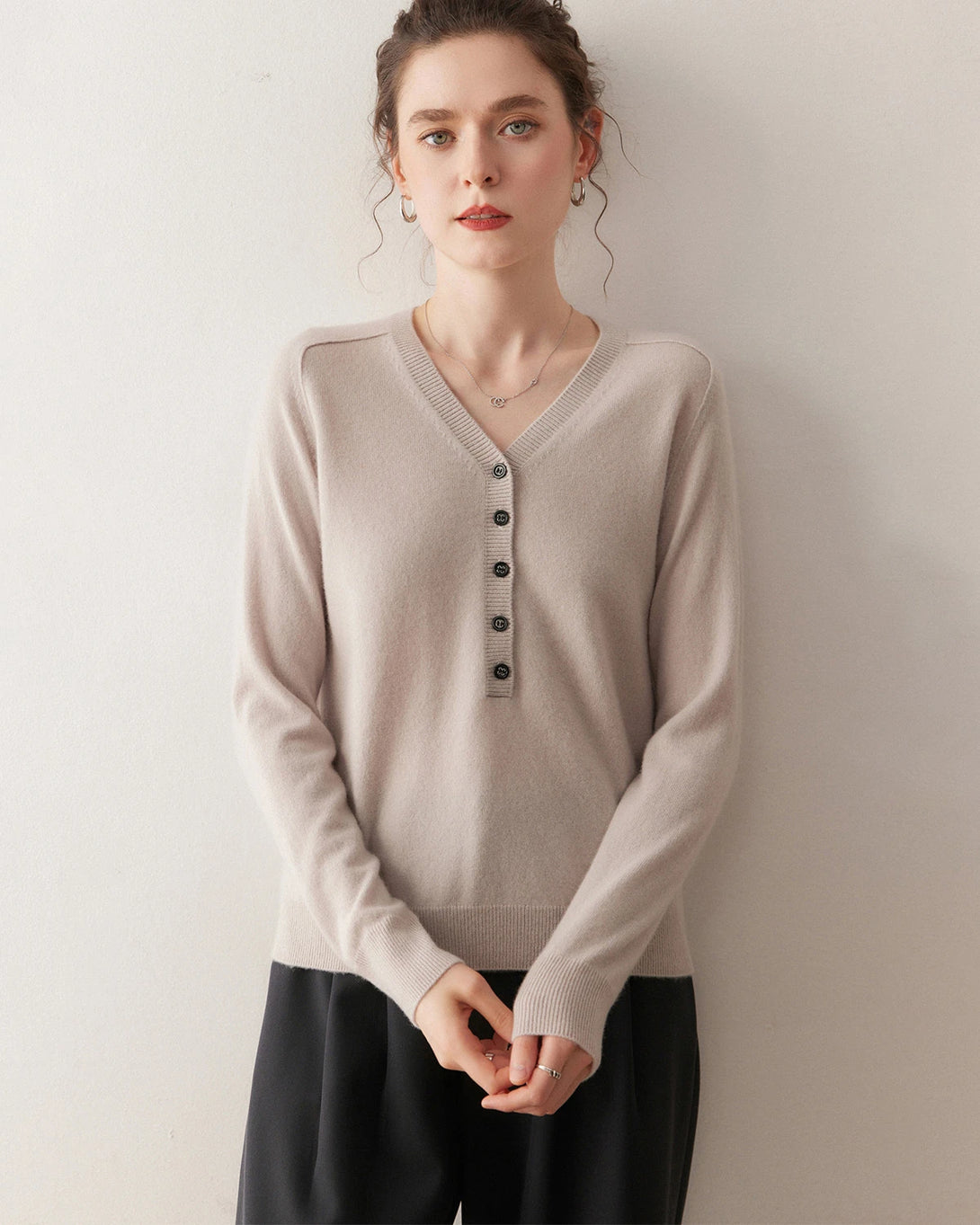 Designed with a graceful V-neckline and a modern saddle shoulder structure, this half cardigan blends casual chic with classic charm. The clean front opening and refined silhouette enhance the natural drape of luxury cashmere sweater craftsmanship, ideal for women who value understated sophistication and comfort.