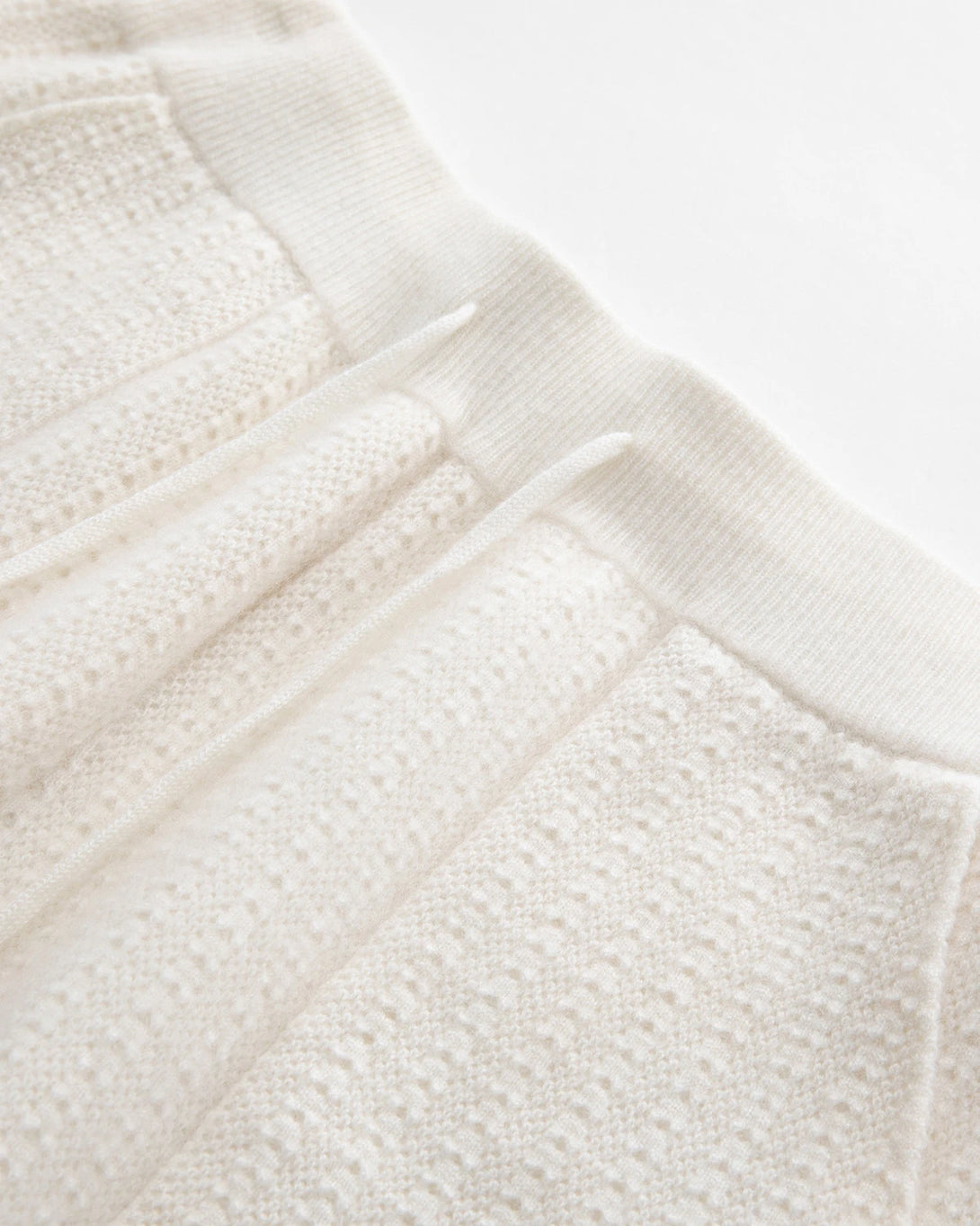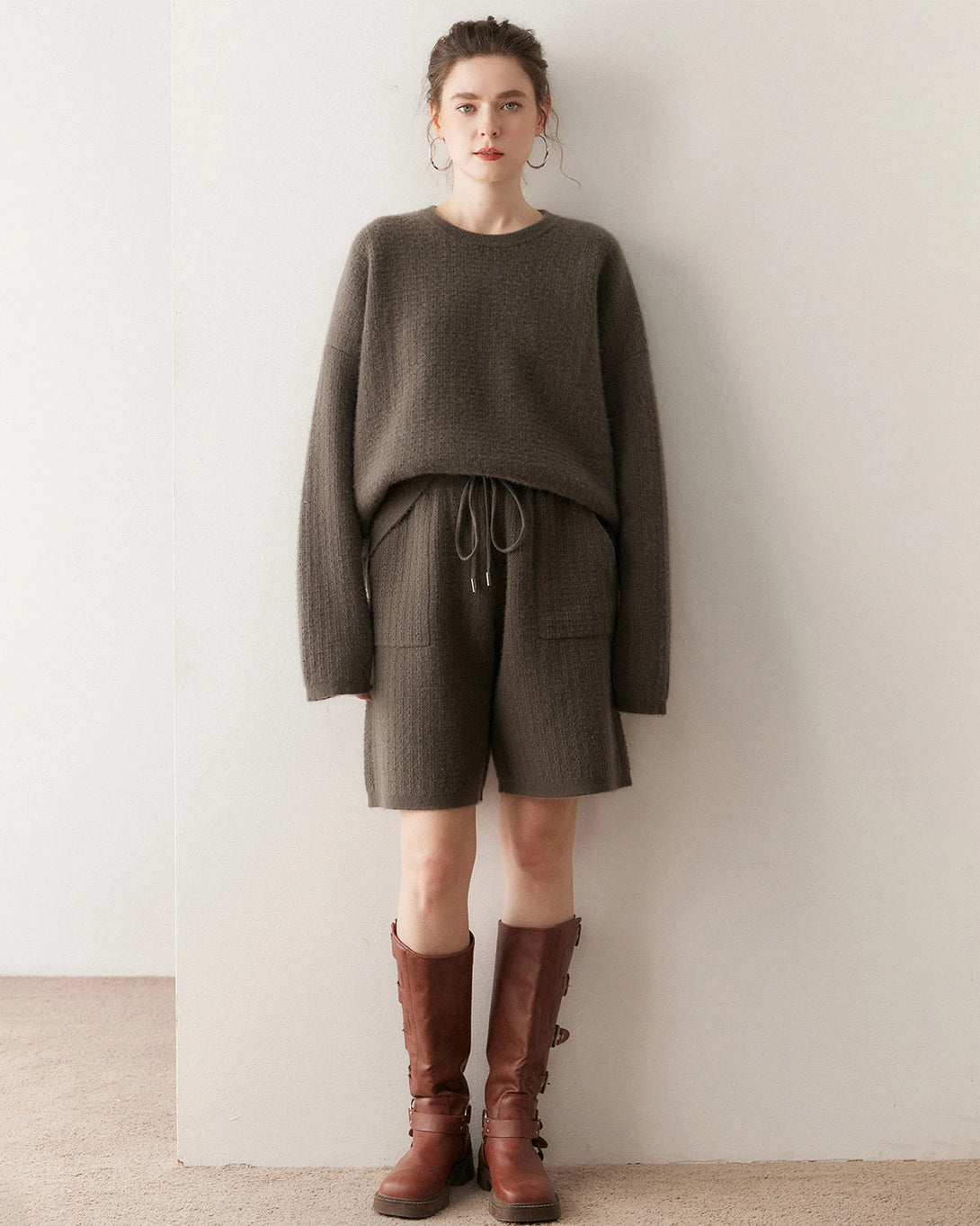 This cashmere sweater set features a relaxed dropped-shoulder pullover and wide-leg knit shorts for effortless comfort and versatility. The loose-fit top adds a modern, laid-back silhouette, while the drawstring waist on the shorts ensures a personalized fit. The subtle texture of the woolen shorts balances casual charm with refined craftsmanship. Whether you choose classic neutrals or white knit shorts, this set embodies easy elegance and timeless appeal—perfect as a cashmere set for women or a cozy knit shorts outfit for daily wear.